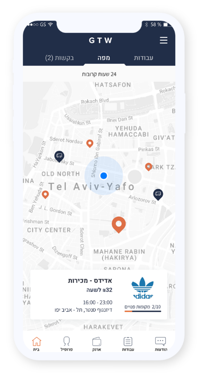 הפלטפורמה החדשנית של GTWORK מאפשרת לך לחפש את המשרות המתאימות ביותר עבורך על פי תאריך, מיקום, תעריף שעתי ותיאור מפורט של התפקיד. קל, פשוט ונוח.